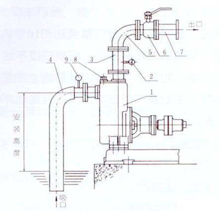 1. 泵 2.壓力表 3.出口垂管 4.吸入硬喉管 5.彎頭 6.流量控制閥 7.出口管路 8.加液螺塞 9.真空表