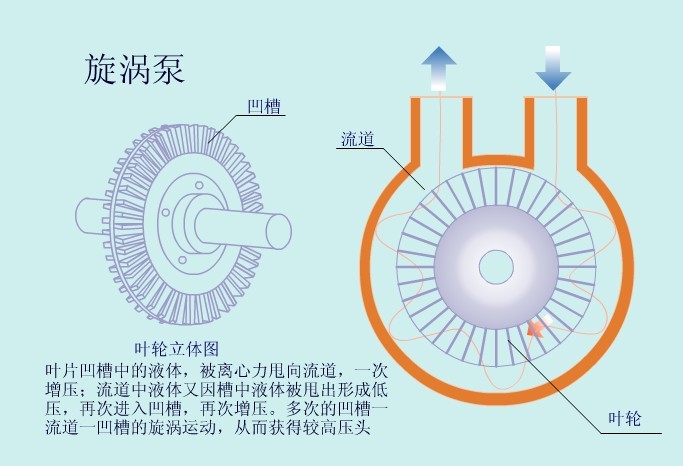 旋渦泵(也稱渦流泵)是一種葉片泵。主要由葉輪、泵體和泵蓋組成。葉輪是一個(gè)圓盤,圓周上的葉片呈放射狀均勻排列。泵體和葉輪間形成環(huán)形流道,吸入口和排出口均在葉輪的外圓周處。吸入口與排出口之間有隔板,由此將吸入口和排出口隔離開。