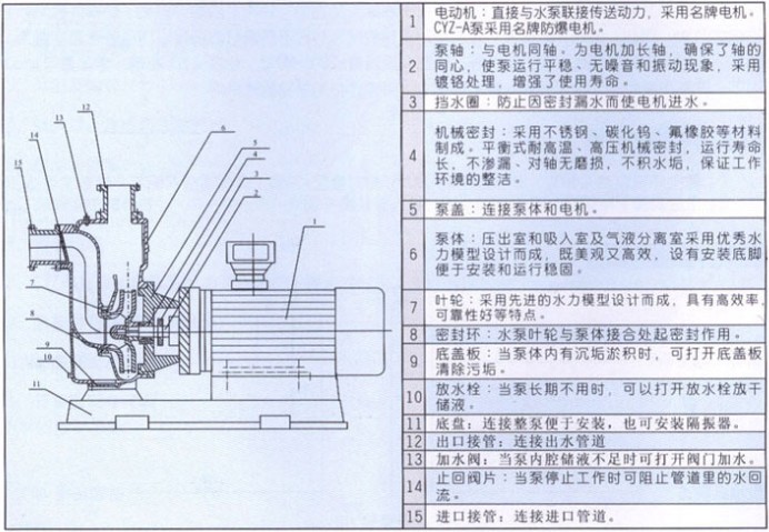 1、電動機(jī):直接與水泵聯(lián)接傳送動力,采用名牌電機(jī)。CYZ-A泵采用名牌防爆電機(jī)。